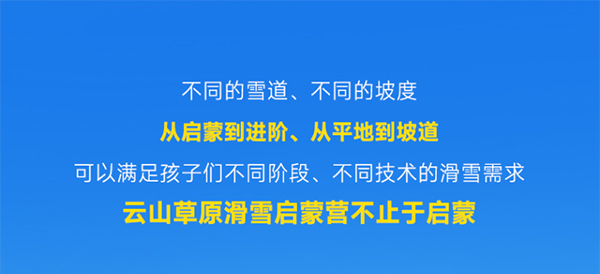 不同的雪道、不同的坡度,从启蒙到进阶、从平地到坡道,可以满足孩子们不同阶段、不同技术的滑雪需求,云山草原滑雪启蒙营不止于启蒙。