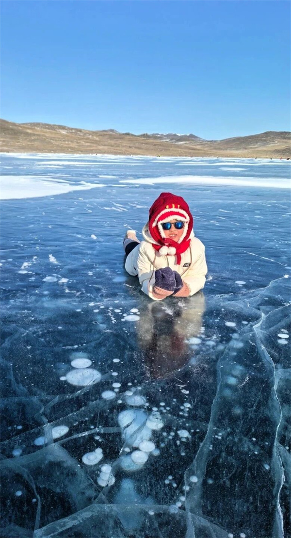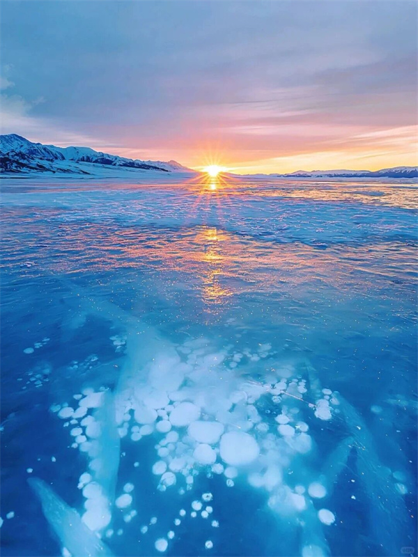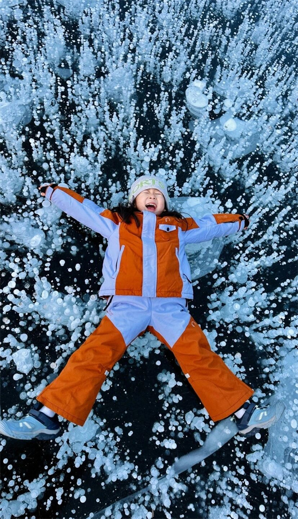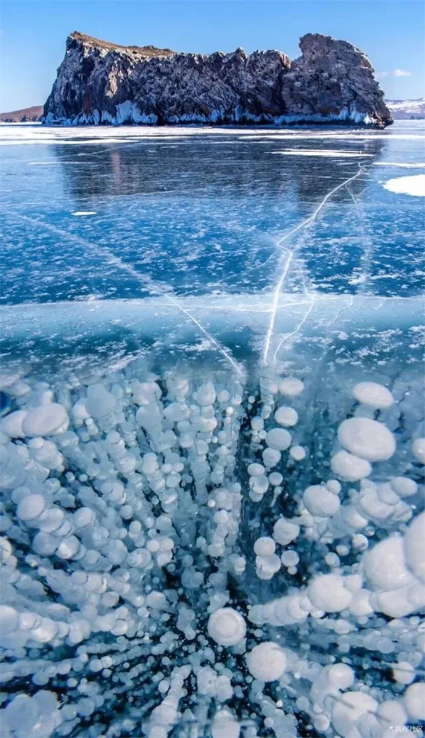 这些美丽的气泡其实是来自湖泊底部的沉积物释放的甲烷气体。这些沉积物释放的沼气(甲烷)在上升过程中,因极寒气温导致冰封速度过快,被"锁"在冰层之中,形成了奇异的"气泡冰"。这些层层叠叠的冰泡,犹如大自然创作的艺术品!仿佛看到了地球呼吸的痕迹!