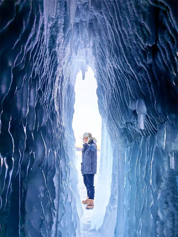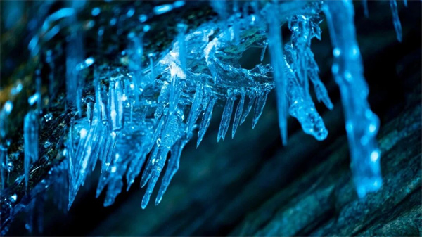 冰窟中的冰柱看起来像颠倒的哥特式建筑尖顶,有的可超过3米长。逆光拍摄时,这些冰晶结构会呈现出令人惊叹的美景,如同置身于梦幻的水晶宫中。