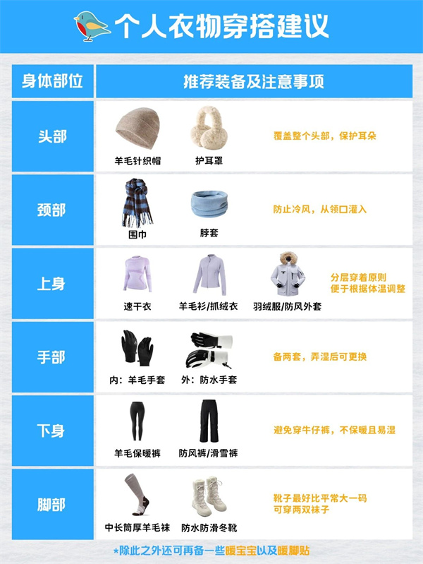 我们冬令营期间(1月25日-1月30日),贝加尔湖地区的气温通常在-18°C至-3°C之间,如遇寒流来袭温度可能降可能更低!因此保暖措施至关重要,尤其是手脚和面部。以下是专为宝贝和大朋友准备的穿搭建议: