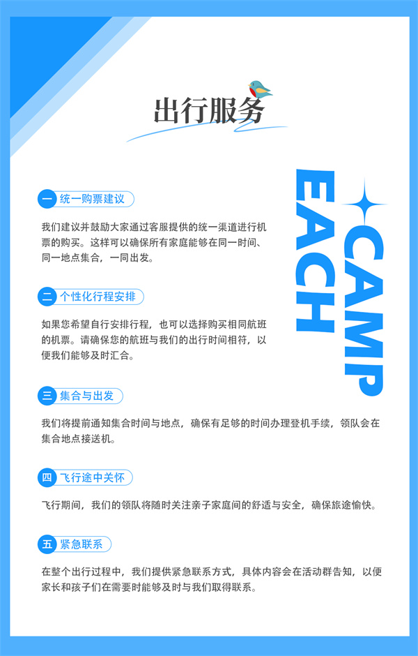 可宝贝单飞,也可亲子出行,单飞宝贝在北京与老师一同出发~亲子家庭可以自行购票,也可以联系客服通过小程序统一购票。若您选择自行购票,请在购票成功后将您的出行信息发送给我们的客服,以便我们安排老师为您提供接机或接站服务。