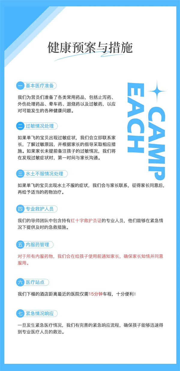 常备医药,即时处理: 我们的带队老师随身携带医药急救包,有创可贴、碘伏棒、酒精棉、腹泻药、止血带、常规儿童中成药等常备药物。能及时处理磕碰擦伤等常见情况。