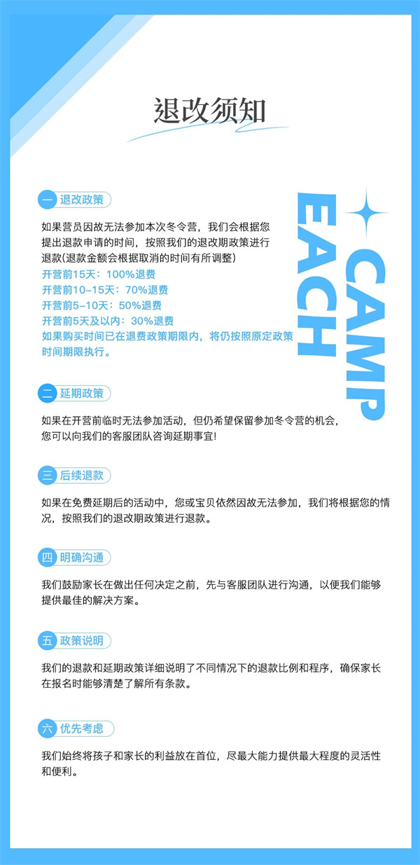 我们理解不可预见的情况可能会影响您和家人的行程安排。因此,我们提供灵活的退款和延期政策,以确保您和家人能够在最佳条件下参加我们的冬令营