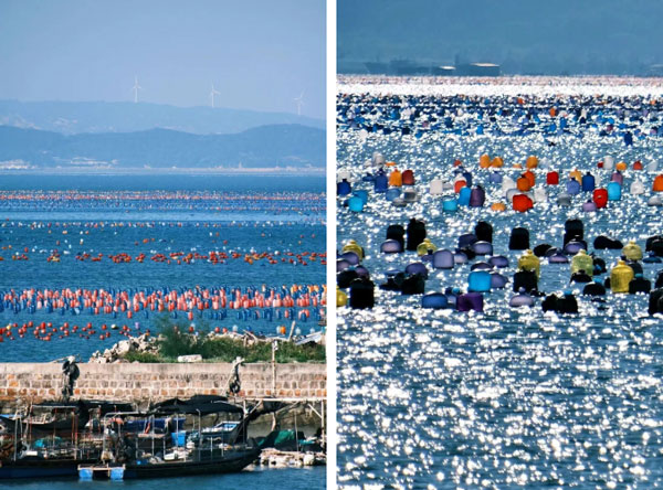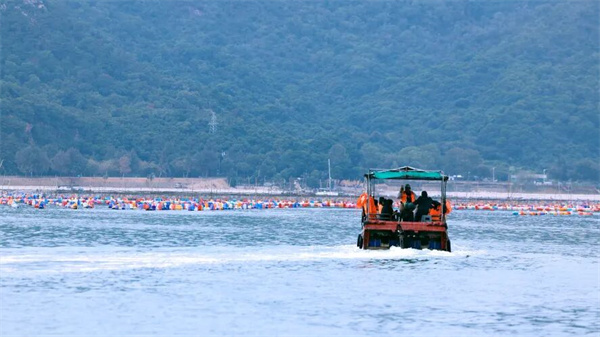 蔚蓝无垠的海面上,数以万计的彩色浮球整齐排列,随波起伏如点点繁星,在阳光下交织出橙、蓝、绿、白的绚烂条纹,串连成一道道漂浮在海面上的“彩虹”。