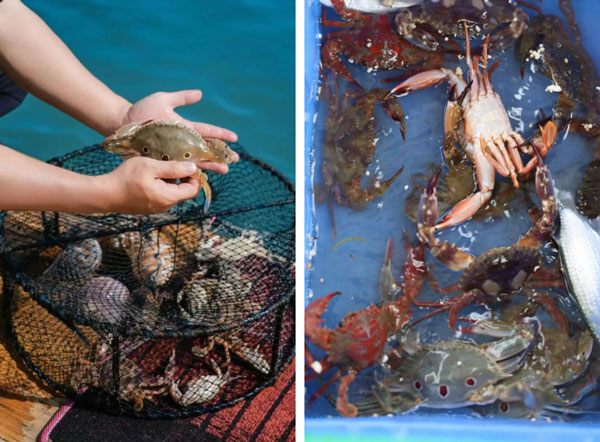 到了近海的礁石区,作为“渔民”的我们还有一项工作要做——收蟹笼。将提前放置的蟹笼一个个提拉上来,打开笼盖的瞬间同样充满乐趣:张牙舞爪的螃蟹挥舞着大钳,展现了最生猛的模样。
