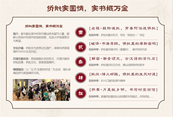 进入侨批文化馆,我们化身1940年代潮汕侨乡留守儿童,通过五大闯关关卡、六大互动体验一步步破解父亲海外来信中的加密信息,在战火中传递思念与希望。在环环相扣的剧情推进中,亲身体验当年华侨谋生的不易与批局运作的智慧。