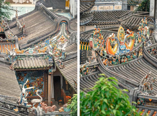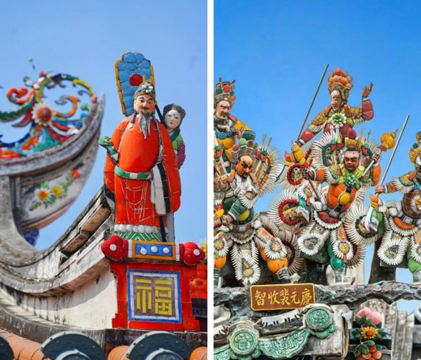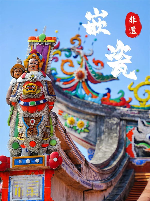 在潮汕,有一种盛开在屋顶上的“永生花”,被誉为“永远亮丽的造型艺术”——嵌瓷。匠人将彩瓷片剪裁、拼嵌、镶嵌,组合成千姿百态的神将、仙佛、飞禽走兽。远看气势磅礴,近看细节灵动!