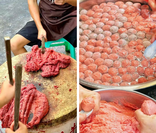 原因便在那铁锤千百次击打之下!在老师傅指导下尝试挥臂捶打牛肉,感受牛肉在三千次锤击间从鲜红肉块蜕变为雪白肉浆。当肉浆在掌心反复摔打,逐渐紧实弹韧,才能真正领悟了潮汕人“食不厌精”的执着匠心。