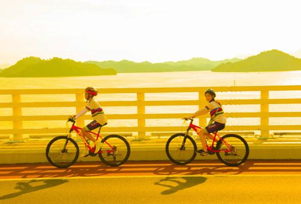 早上睡觉至自然醒后酒店集合,由营地导师带领大家骑行挑战--千岛湖经典绿道,沿途景色各异,各具特色,途径骑行桥、上江埠大桥,直到终点自营营地——骑士营地