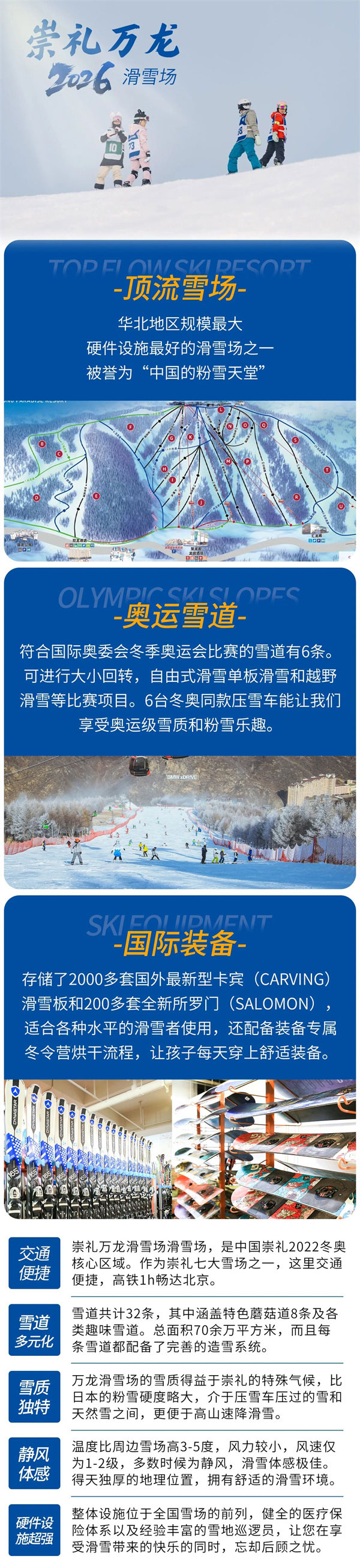 崇礼万龙滑雪场,是2022冬奥核心区域“中国雪都”崇礼。这里是华北地区最理想的滑雪地域,东方的“达沃斯”,专业的雪道,优质的粉雪,自然成了雪友们向往的所在。