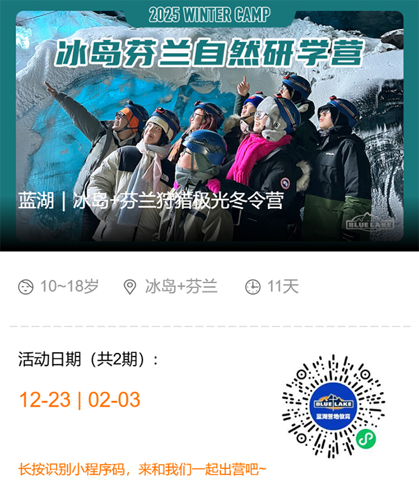 冰岛芬兰行程去年一出来,很快就报满了,成员参与满意度也非常高!独立单飞营之外,也开放了亲子营,不仅可以满足全家出游的需要,也邀请更多爸爸妈妈们来切实感受蓝湖的专业与品质。但为了保证项目的质量,我们也会严格控制成团人数,真的是席位有限,先到先得啦。