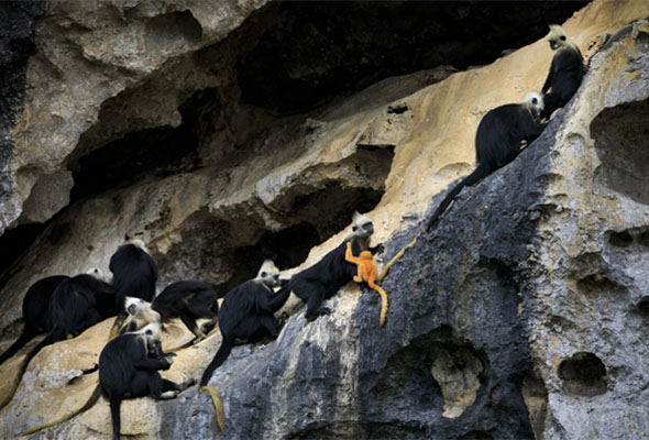 生活在喀斯特石山环境的白头叶猴,是战胜了环境的挑战,成为最适应喀斯特石山环境的灵长类。这些山上没有地表水,它们就从食物中获得身体所需水分,它们喜欢采食的嫩叶、嫩芽等食物的含水量超过。酷热的夏季,它们清晨完成觅食,待气温升高前就躲到树荫下。