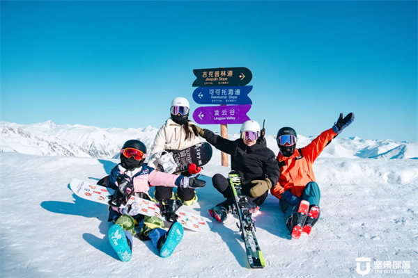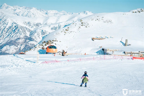 乘坐缆车抵达云霄峰便可一眼望四国,从这里进入可可托海道,和孩子挑战人生第一条11千米的滑雪道,滑雪的快乐一半在下滑的风里。