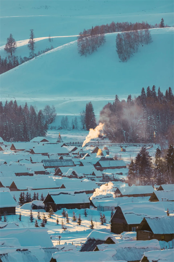 当第一场雪落下,整个阿勒泰便开始了一场盛大的变身。群山披上银装,森林挂满雾凇,喀纳斯湖面凝结成巨大的天然镜面,倒映着湛蓝的天空。清晨,禾木村的木屋炊烟袅袅升起,与晨雾交织在一起;正午,阳光洒在雪原上,闪烁着钻石般的光芒;傍晚,夕阳为整片雪野镀上金边,美得让人屏息。