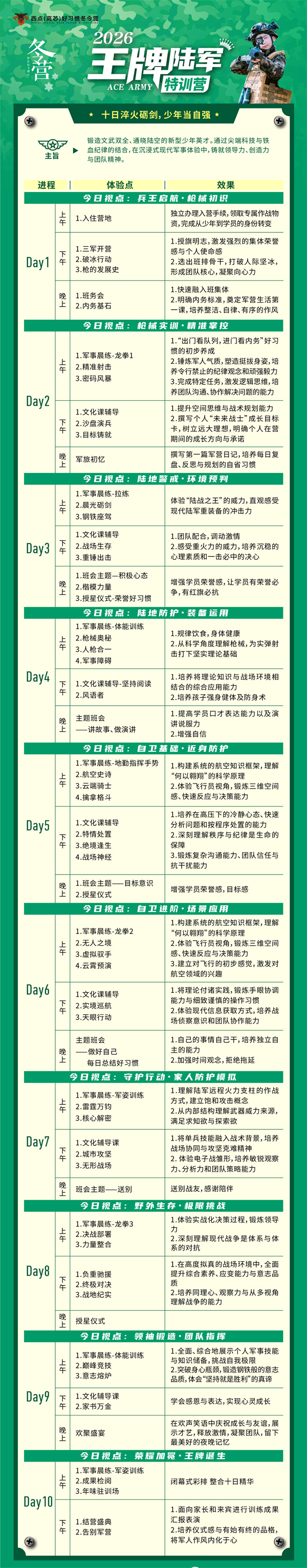 | 学员守则 | 1、学员须严格遵守营地规章、纪律和作息时间,以保证每天有充沛的精力参加军事训练和其他各项训练;