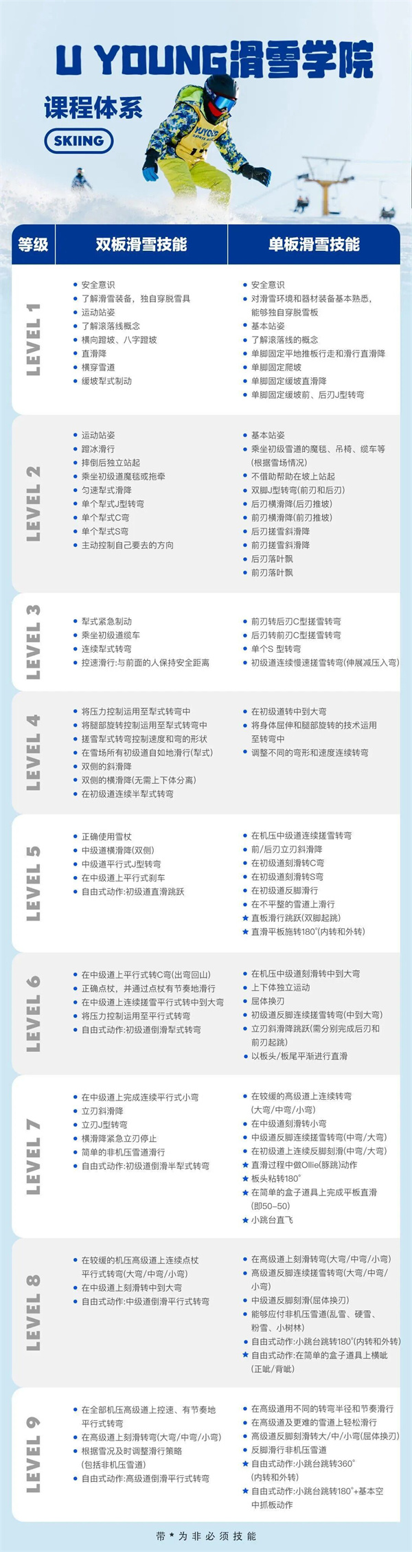 在UYoung滑雪学院教学体系中,学院依据中国滑雪协会滑雪体系,将滑雪划分为1-9个等级。