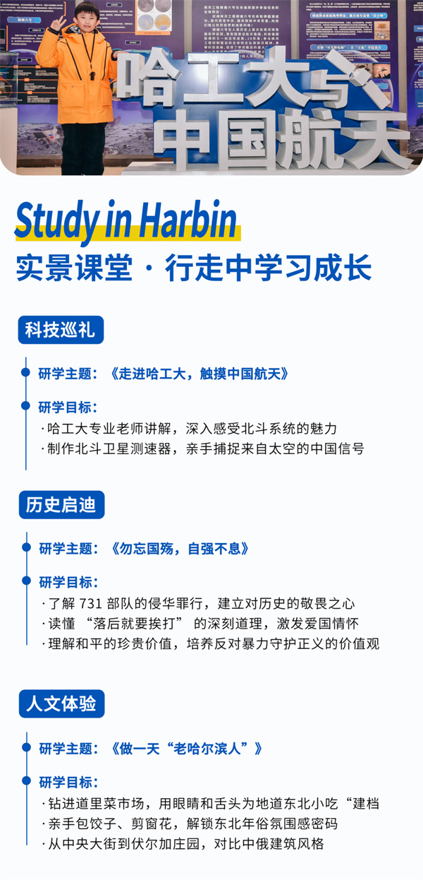 在这零下20℃的空气中,孩子们将亲眼见证,冰雕玉砌的建筑奇迹在极寒中依然蓬勃的生命力;而在在东北虎林园,孩子们将直面林海雪原间野性基因的守望。而这不单是一场视觉艺术的盛宴,也更是一场深度的「游学之旅」:在侵华日军第七三一部队罪证陈列馆的历史课堂,读懂“自强”二字的重量;在国防七子之首的哈工大,探秘国之重器背后的科技力量;百年沧桑与未来科技,在这座城市深度交汇。