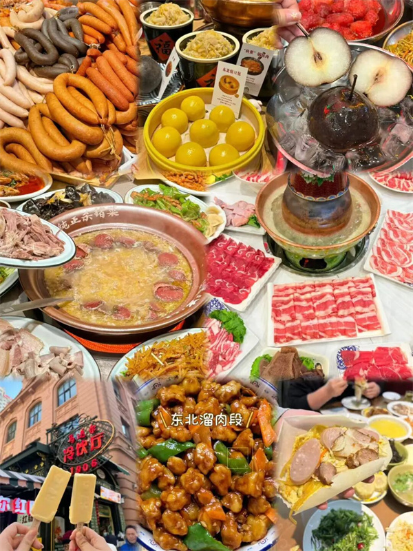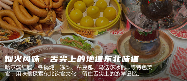 冰城的烟火气息里,藏着最地道的东北味道。咸香烟熏味的哈尔滨红肠、咬下软糯香甜的粘豆包、丰富多汁的冻梨、冰爽奶香的百年马迭尔冰棍、外酥里嫩的溜肉段、鲜香解腻的杀猪菜,用薄如纸的春饼卷、满族火锅、东北铁锅炖……