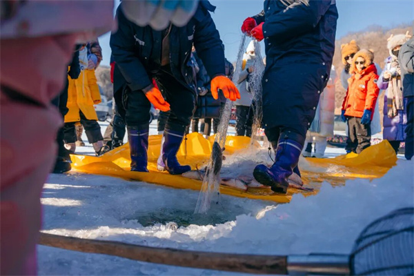 我们带孩子跟着老渔民学习辨认冰层厚度、选择下网点,挥舞冰镐凿开冰面,将带着浮标的渔网缓缓沉入水下等待鱼儿入网;冰钓环节里,孩子使用简易冰钓竿,在冰洞旁静坐观察鱼漂动静…当看到渔网拉出水面时万鱼跃冰的壮观,或是冰钓竿传来鱼儿上钩的拉力,孩子们收获到不仅是简单的喜悦,更是能读懂东北人“靠冰吃冰”的生存哲学密码。