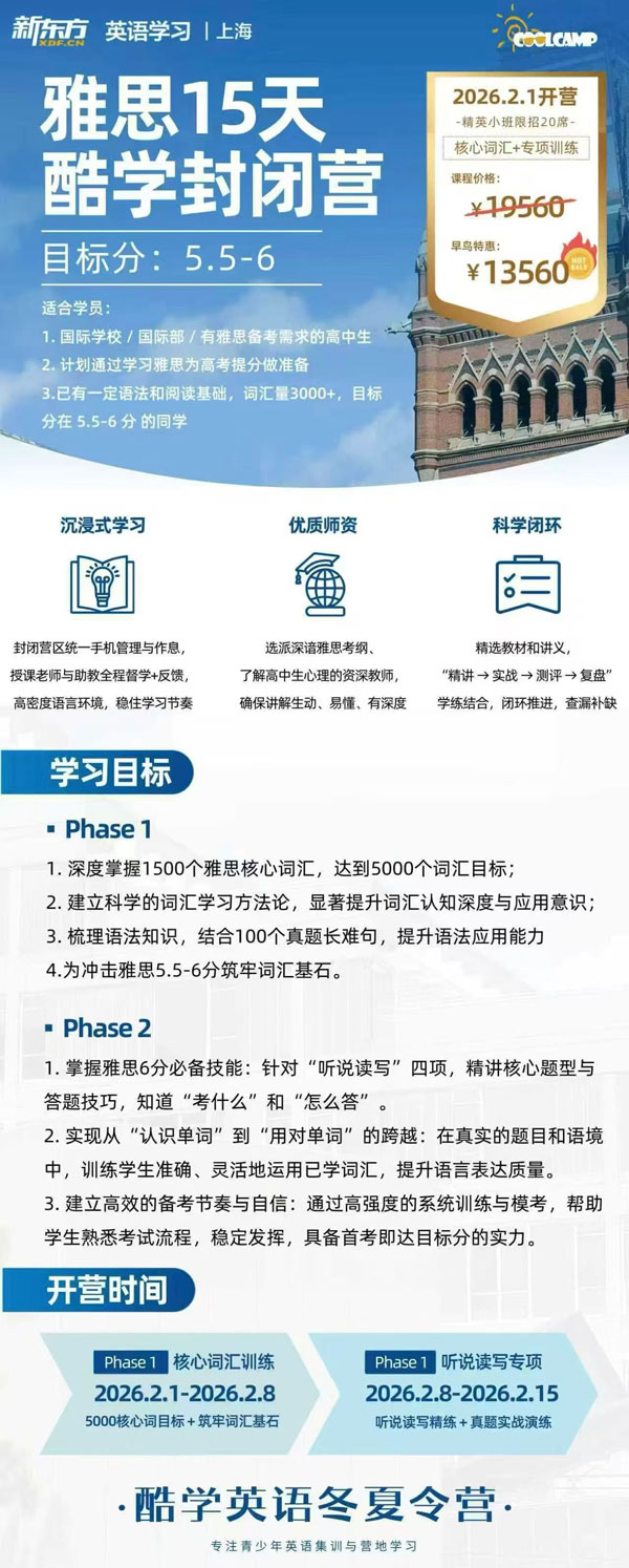 「上海英语」2026新东方酷学“高中雅思核心词汇”冬令营(15天)国际学校/国际部备考雅思的高中生