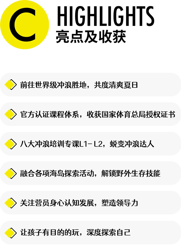 我们的目标不仅是教会营员冲浪技能,更是要培养营员对冲浪的热爱,成为孩子们终身可持续的户外运动。通过寓教于乐体验式教学(理论+训练+海上实践+海岛探索),营员们在收获技能的同时获得快乐,玩与学两不误。这次多彩的冲浪之旅,足以丰盈孩子整个暑假。