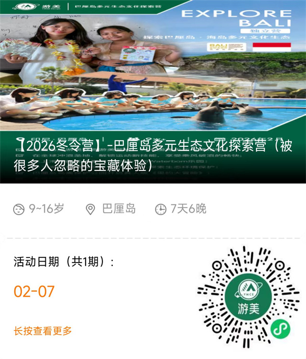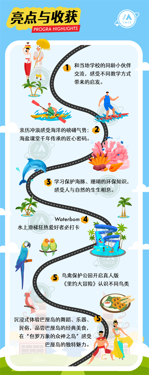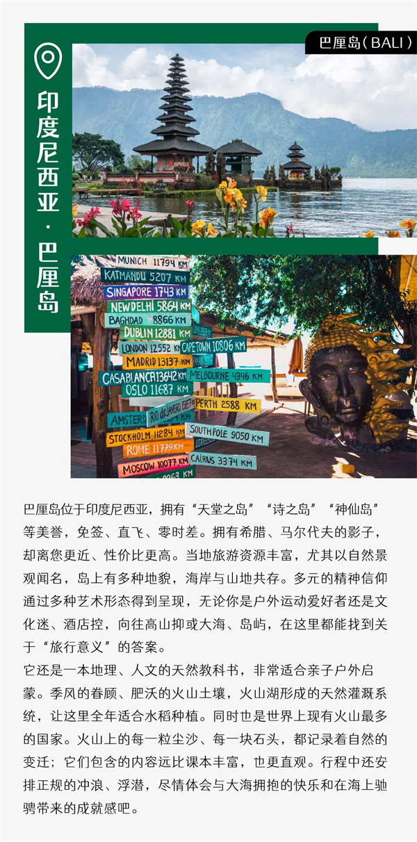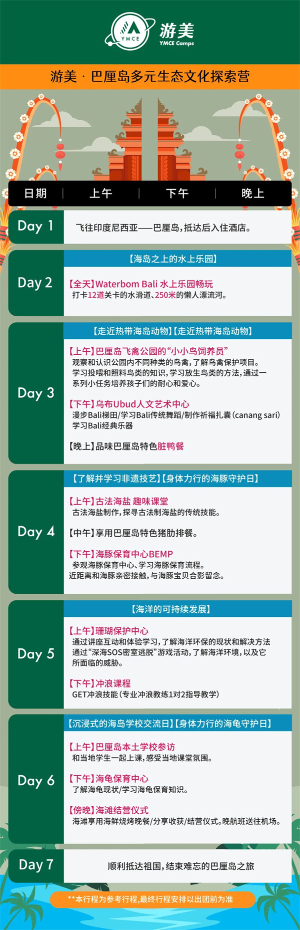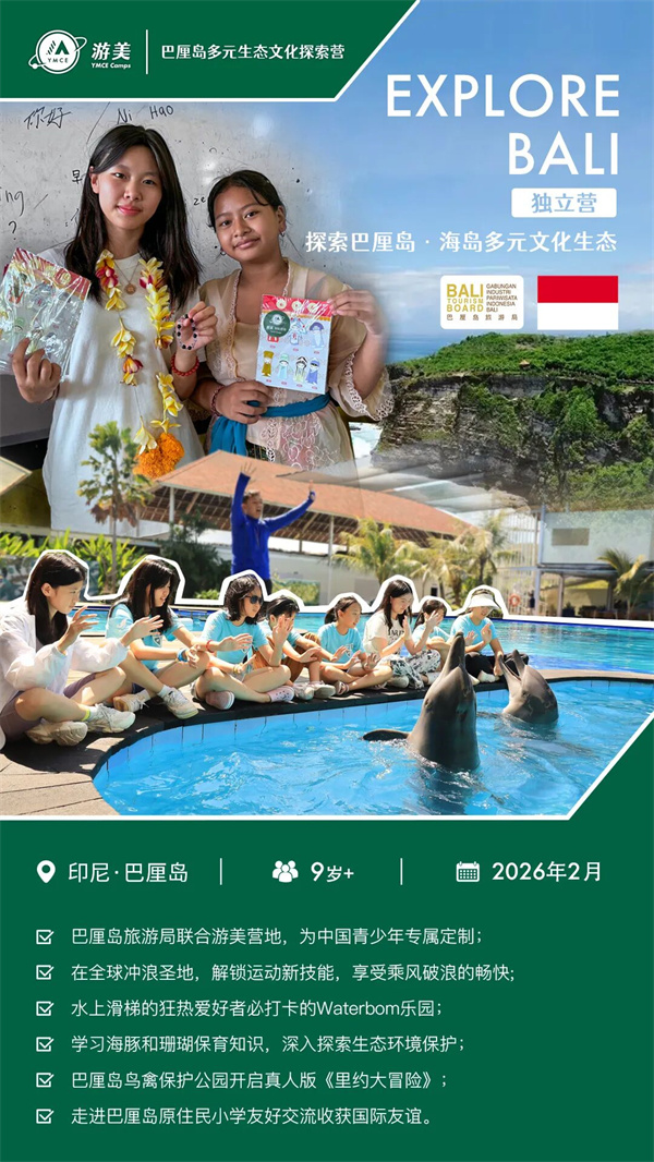 本次游美·巴厘岛多元生态文化探索独立营,由巴厘岛旅游局为游美营地专属定制,跟随游美的脚步共同走进南纬8°,从人文到艺术、从户外运动到自然探险、从感官精神到特色美食,上山下海,返璞归真,充分链接大自然,打开人生旷野的新地图。